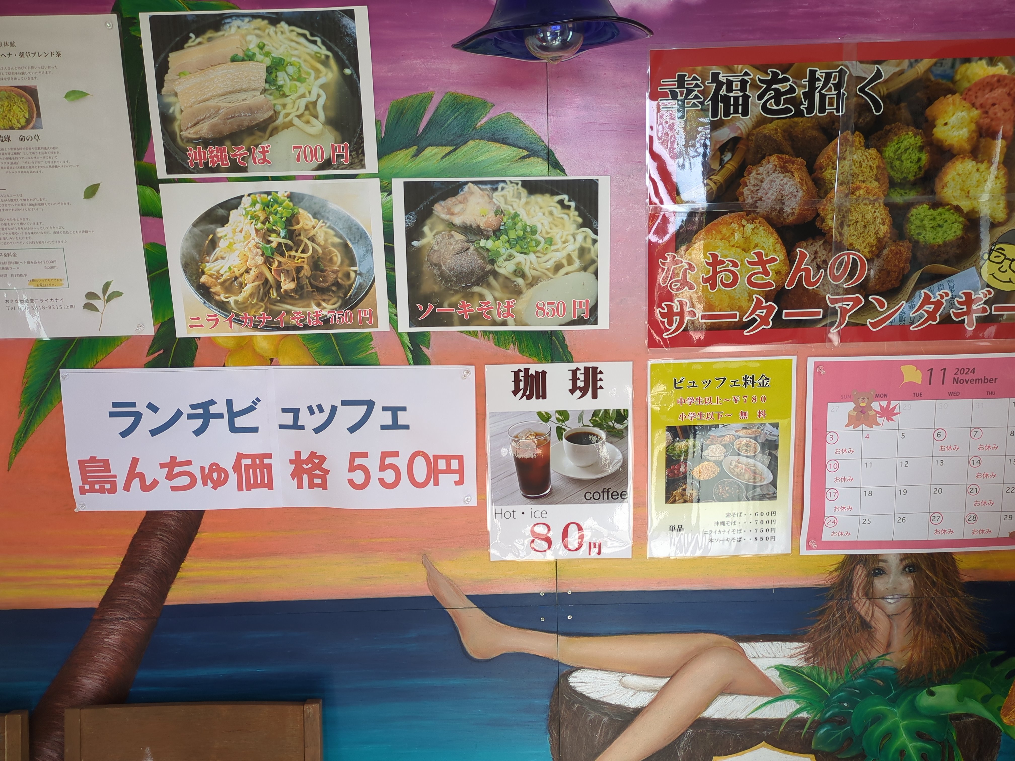 さて、今回の目的はランチビュッフェ。島んちゅ価格550円という驚きの価格で、豊富な料理が楽しめる。ビュッフェの内容は、サラダや副菜、メインディッシュが揃っており、特に沖縄の伝統的な料理が多いのが特徴だ。お店の公式サイトによると、ビュッフェは毎日開催されており、地元の新鮮な食材を使用しているとのことだ。