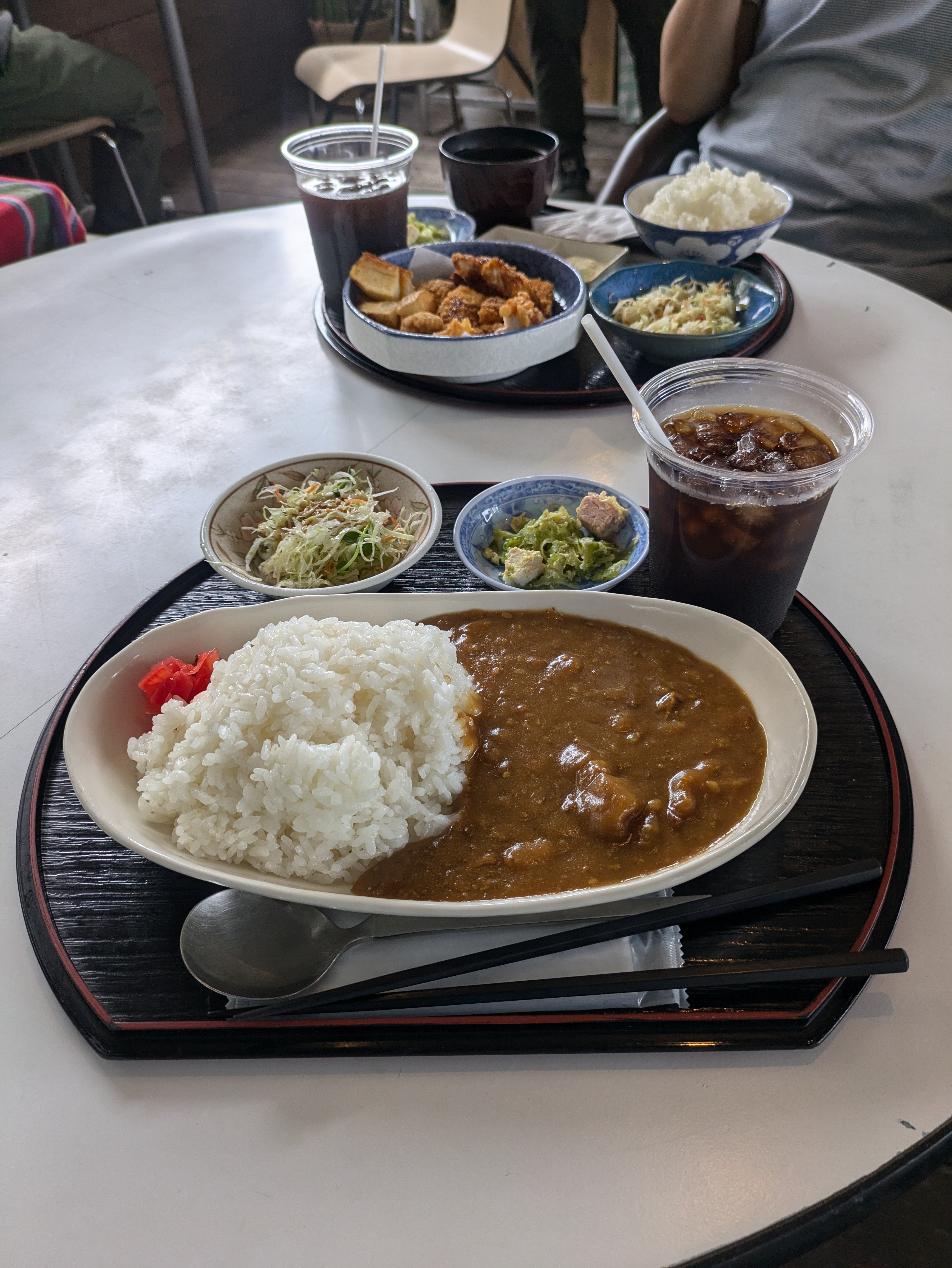 さて、今回私が選んだのはカレーです。見た目からして食欲をそそる一皿で、ライスの横には紅しょうがが添えられています。カレーはスパイシーで、コクがあり、まろやかな味わいが特徴です。具材もたっぷり入っていて、食べ応えがあります。相方はカツ丼を注文しましたが、こちらも美味しそうでした。カツはサクサクで、卵とじの部分が絶妙に絡んでいて、見た目にも美味しさが伝わってきます。
